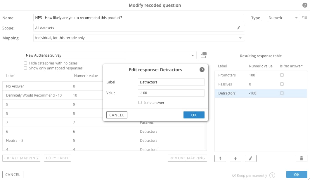 If a 0-10 ratings ‘recommendation’ question is included in your study, leverage the Recode feature in Halo Reports to calculate the Net Promoter Score.