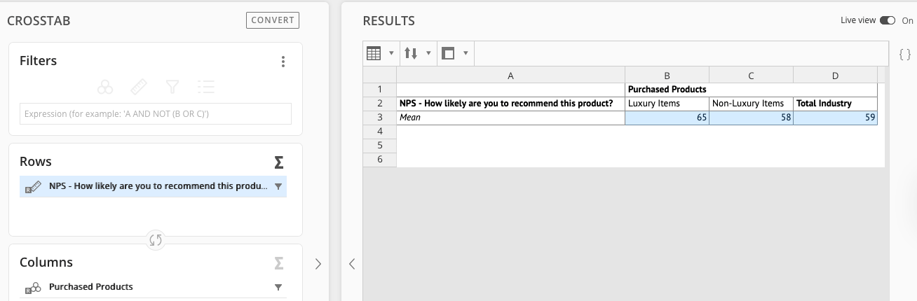 View the Results: The NPS value in the Halo Reports Crosstab results is displayed as a mean value (with decimals). To display the NPS as a whole number, go to User settings, select the Results tab, and change the Numeric statistics to display 0 decimal places. This value is the actual NPS score.