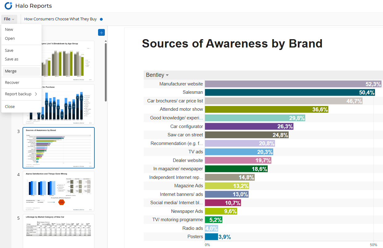 Storybuilders can extend their reports using the Merge action available in the File menu. This action allows them to select a source report and combine its content into their target report.
